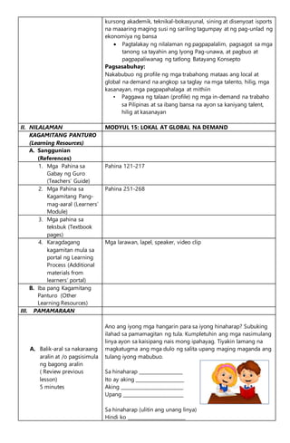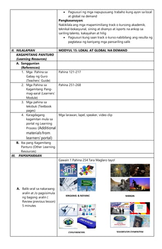 Terms in this set 41 tayo ay nilikha upang makipagkapuwa at makibahagi sa buhay-sa-mundo lifeworld at itong buhay-na-mundo ay nabubuo naman sa pagkomunikasyon sa kanyang mga kasapi. 151 Natutukoy ang mga trabahong may mataas na lokal at global na demand 152 Nakikilala ang mga mapamilihang track o kursong akademik teknikal bokasyonal sining at disensyo at isports na angkop sa sariling talento kakayahan at hilig. Magtanong at humingi ng payo sa mga nakatatanda.